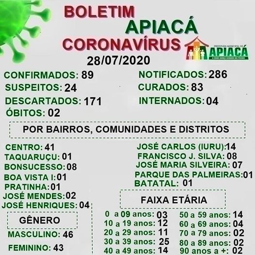 A Prefeitura Municipal de Apiacá, tem como compromisso de transparência nas ações do COVID-19, através da Secretaria Municipal de Saúde comunicar que temos 83 casos curados, com total de 89 casos, um trabalho que compromete toda a equipe de saúde e principalmente dos usuários que fiquem em isolamento social.