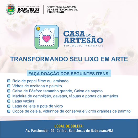 A Prefeitura Municipal de Bom Jesus do Itabapoana, através da Secretaria Municipal de Assistência Social visando que alguns objetos são considerados lixo descartável para a maioria da população, mas para os artesãos da nossa cidade e região são produtos que podem ser reutilizados como matéria-prima para transformar lixo em arte. Com isso, o artesanato passa a ser um grande referencial de uma reciclagem com responsabilidade ecológica, beleza e qualidade das peças produzidas e comercializadas